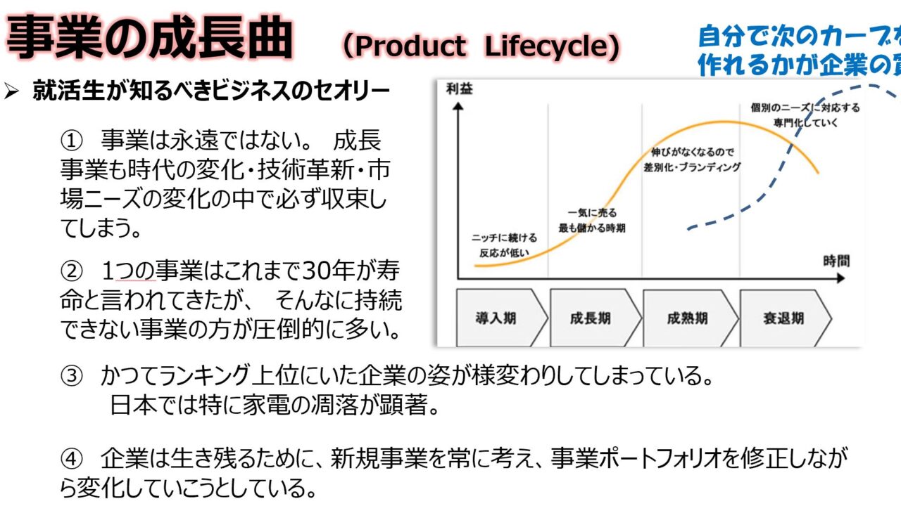 就活準備塾の中でも会社選びの際に留意すべきこととして 「事業は永遠ではない」ということを「事業の成長曲線」という理論を引き合いに出して学生たちにこう話していました。「〇〇の仕事がしたくて会社を選んだところで、時代とともに事業・業容は変わってしまうんですよ。もっと言えば、会社がなくなっていることもたくさん事例がありますよ。」と